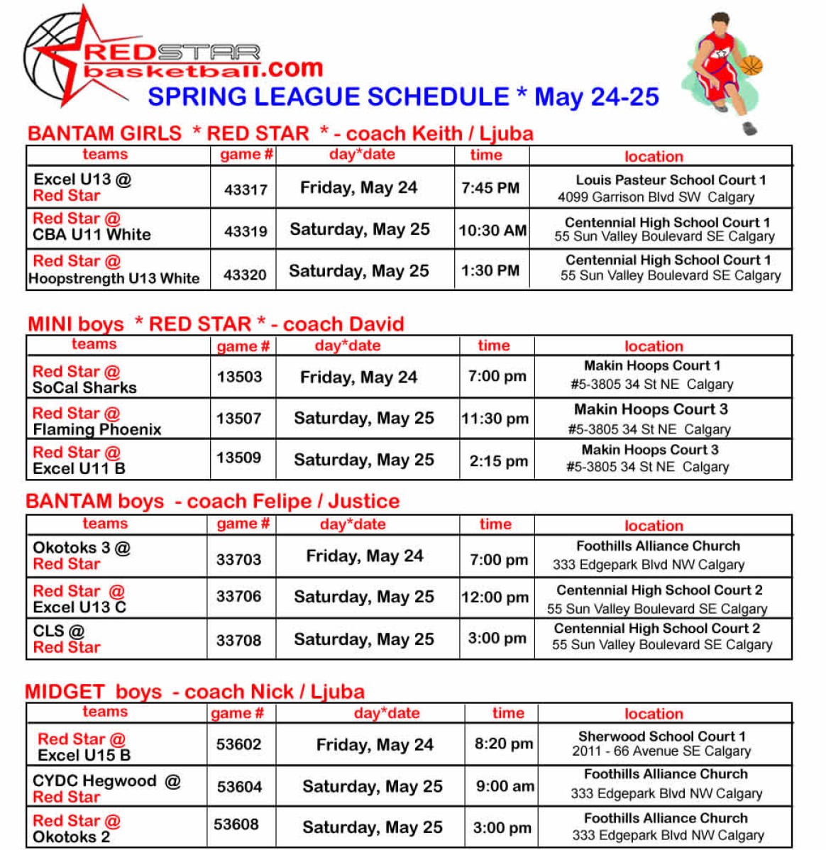 SCHEDULE of 2019 SPRING LEAGUE GAMES – Saturday and Friday, May 24 & 25