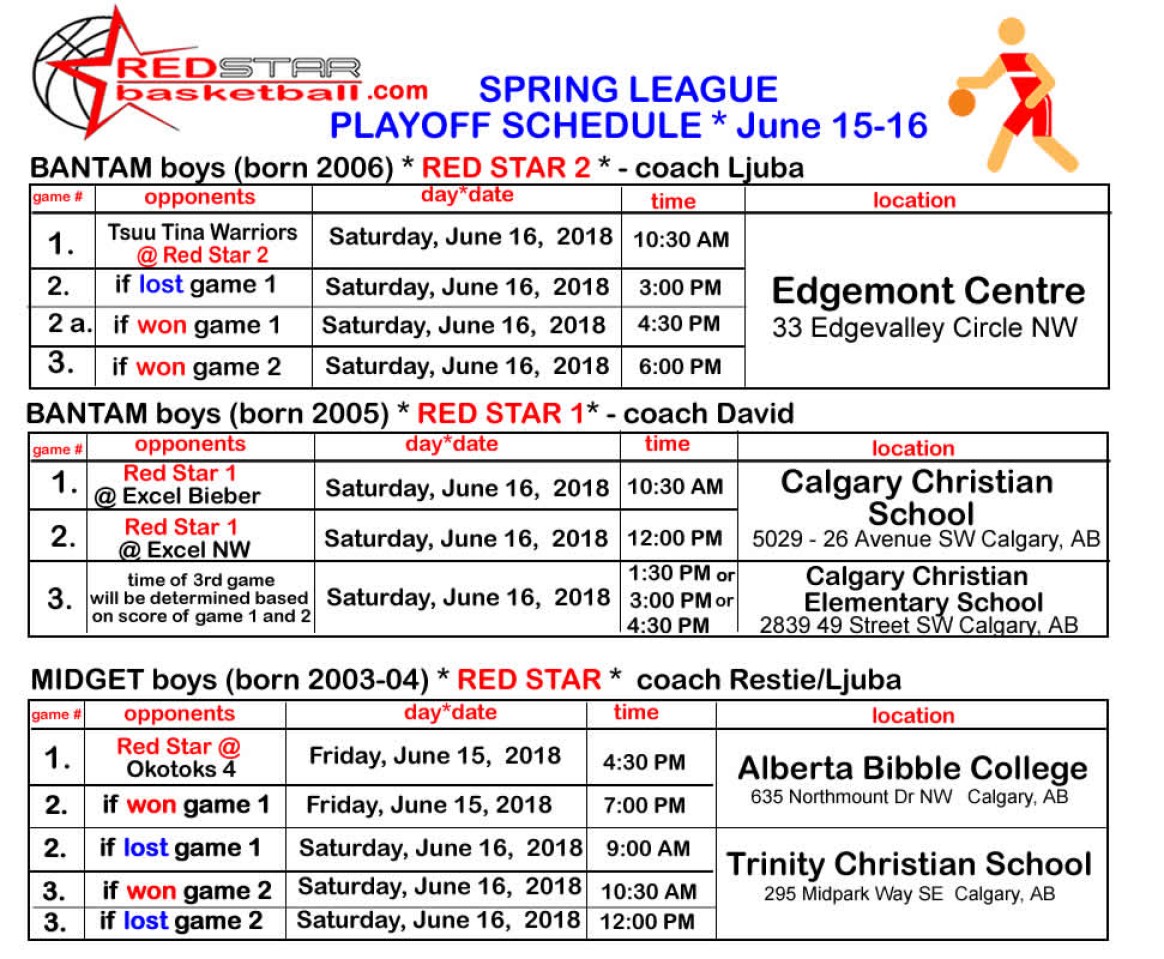 OUR BANTAM and MIDGET teams will play their SPRING LEAGUE PLAYOFF games on JUNE 15 and JUNE 16 …Please check the schedule and and if you have any question please contact any of RED STAR coaches at the practices…